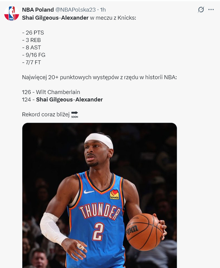 2.SGA连续60个客场拿到20+,雷霆队史第一;